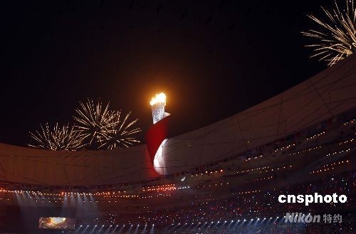 8月8日,第29屆夏季奧運會在北京奧林匹克公園內(nèi)的國家體育場“鳥巢”舉行。李寧點燃北京奧運會主火炬,奧運圣火在鳥巢上空熊熊燃燒。中新社發(fā) 杜洋 攝