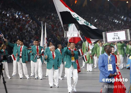 8月8日,第29屆夏季奧運(yùn)會(huì)在北京奧林匹克公園內(nèi)的國(guó)家體育場(chǎng)“鳥(niǎo)巢”開(kāi)幕。圖為伊拉克代表團(tuán)入場(chǎng)。8月4日,伊拉克代表團(tuán)一行11人經(jīng)科威特后再由迪拜轉(zhuǎn)機(jī)搭乘阿聯(lián)酋航空公司航班順利抵達(dá)北京。
