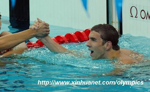 8月10日,美國選手菲爾普斯(右)賽后接受祝賀,他在男子400米個人混合泳決賽中,以4分03秒84的成績獲得冠軍,并打破世界紀(jì)錄。這是北京奧運會首枚游泳比賽金牌。 新華社記者陳凱攝