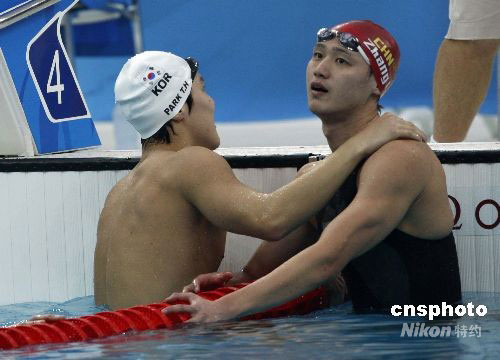 8月10日,北京奧運(yùn)會游泳項目男子400米自由泳決賽上午在水立方舉行,韓國選手樸泰桓以3分41秒86獲得金牌,中國選手張琳(右)以3分42秒44獲得銀牌,圖為二人互相致賀。中新社發(fā) 杜洋 攝