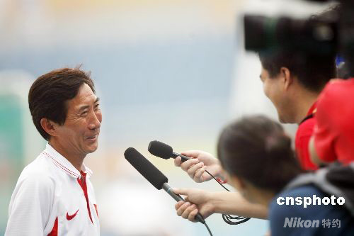 8月10日,中國女曲在奧運會女子曲棍球小組賽首場比賽中以3:0戰(zhàn)勝西班牙隊。圖為中國隊主教練金昶伯賽后笑逐顏開。 中新社發(fā) 武仲林 攝