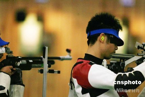 8月11日,中國選手朱啟南在北京奧運會男子10米氣步槍預(yù)賽中。 中新社發(fā) 武仲林 攝