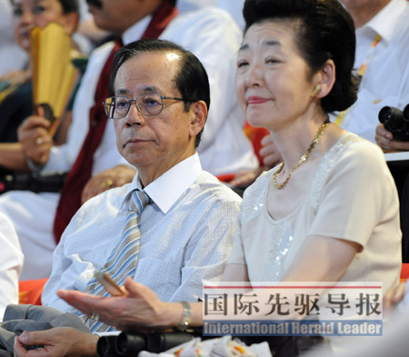 8月8日,福田康夫和夫人在北京奧運(yùn)會(huì)開幕式上。記者 黃敬文/攝