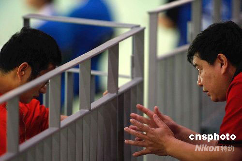 8月12日,北京奧運(yùn)會(huì)男子50米手槍比賽在北京射擊館開戰(zhàn),譚宗亮和林忠仔代表中國射擊隊(duì)出戰(zhàn)。圖為在資格賽中,主教練王義夫臨場(chǎng)指導(dǎo)譚宗亮。中新社發(fā) 盛佳鵬 攝