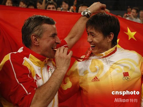 圖為仲滿與教練分享金牌味道。