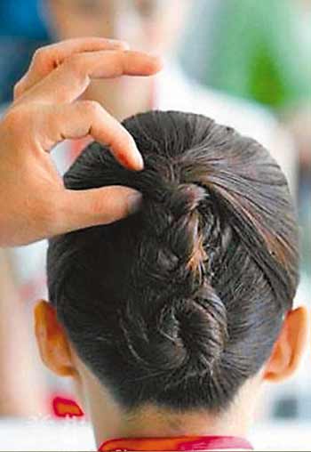 這款發(fā)型較為雅致,頭發(fā)向上向后自然盤成一個(gè)單包,以如意扣連接,下部盤以玫瑰纂,完美地結(jié)合了動(dòng)感奔放與雅致含蓄,其中如意扣是最不突出設(shè)計(jì)因素的設(shè)計(jì)圖案,而玫瑰纂相對(duì)立體的感覺(jué)則充分考慮了側(cè)面的攝像效果。
