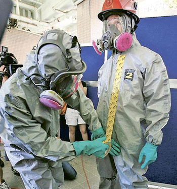 香港消防處救護員配備防生化及核事故裝備,防化衣需用膠條封住,以保證不會滲漏。(圖片來源:明報)