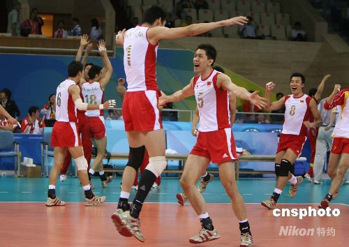 8月14日晚,中國(guó)隊(duì)在北京奧運(yùn)會(huì)男子排球比賽中以3比2戰(zhàn)勝日本隊(duì),提前鎖定8強(qiáng)席位。圖為中國(guó)隊(duì)隊(duì)員們歡慶勝利。 中新社發(fā) 武仲林 攝