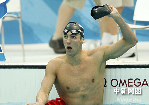 8月15日上午,在國(guó)家游泳中心水立方舉行的北京奧運(yùn)會(huì)男子200米混合泳中,美國(guó)選手菲爾普斯續(xù)寫神話,以1分54秒23的成績(jī)打破由他自己保持的1分54秒80的世界紀(jì)錄,收取他在本屆奧運(yùn)會(huì)的第6枚金牌,也是他奪取的奧運(yùn)會(huì)第12塊金牌。中新社發(fā) 杜洋 攝