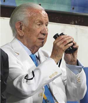 中新網8月15日電 據(jù)香港大公報報道,8月14日,國際奧委會終身名譽主席薩馬蘭奇在香港觀看奧運馬術盛裝舞步團體賽決賽。