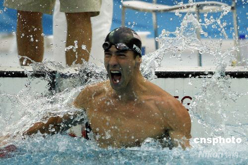8月16日上午,菲爾普斯在北京奧運男子100米蛙泳項目中以50秒58秒的成績奪得他在本屆奧運會上的第七塊金牌。獲得銀牌的捷克選手只比菲爾普斯慢了0.01秒。 此前菲爾普斯已經(jīng)得到了男子400米個人混合泳、男子4×100米自由泳接力、男子200米自由泳、男子200米蝶泳、男子4×200米自由泳接力和男子200米個人混合泳六塊金牌。 中新社發(fā) 杜洋 攝