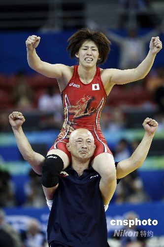 8月16日,北京奧運(yùn)會(huì)摔跤女子自由式55公斤級的決賽在北京中國農(nóng)業(yè)大學(xué)體育館進(jìn)行,日本選手吉田沙保里戰(zhàn)勝中國選手許莉獲得冠軍。圖為吉田沙保里與教練在賽后“疊羅漢”慶祝奪冠。中新社發(fā) 盛佳鵬 攝