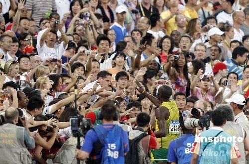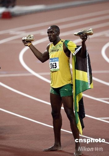 2008年8月16日,在北京奧運會男子百米比賽中,牙買加選手博爾特以9秒69奪得冠軍,并刷新了世界紀(jì)錄。中新社發(fā) 盛佳鵬 攝