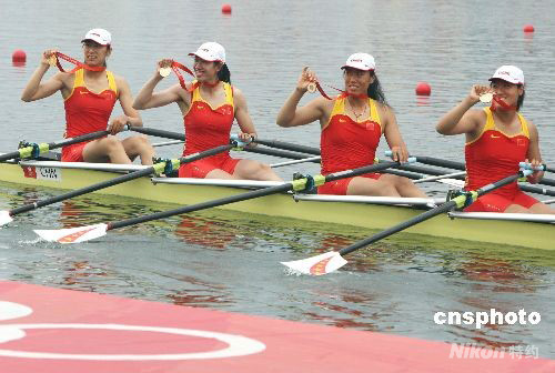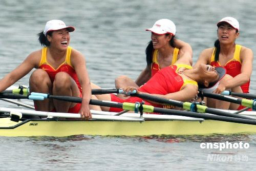 8月17日下午,中國(guó)組合唐賓、金紫薇、奚愛(ài)華、張楊楊在北京奧運(yùn)會(huì)賽艇女子四人雙槳決賽中以6分15秒95的成績(jī)超越英國(guó)、德國(guó)等世界名將獲得冠軍,取得了歷史性的突破。英國(guó)隊(duì)獲得亞軍,德國(guó)隊(duì)獲得季軍。 中新社發(fā) 任晨鳴 攝