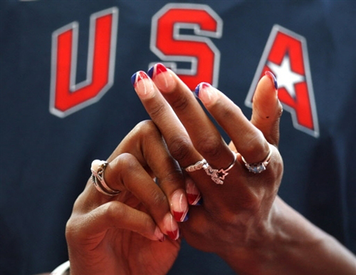 一位美國隊員在女子400米預(yù)賽的賽道上整理自己的手飾,可見這個隊員還是個“時尚先鋒”。