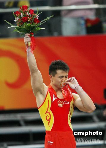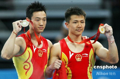 8月18日,中國選手陳一冰(右)在北京奧運(yùn)會(huì)男子吊環(huán)決賽中以16.6分的成績奪得金牌,另一位中國選手楊威獲得銀牌。 中新社發(fā) 武仲林 攝