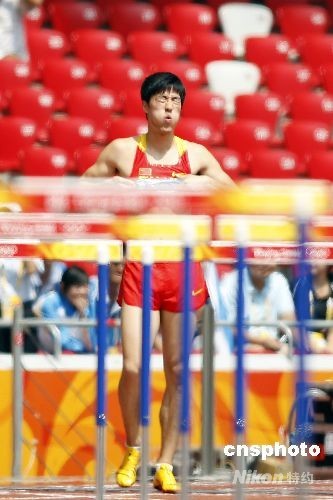 8月18日,在北京奧運男子110米欄第1輪第6組比賽中,中國選手劉翔因腿傷遺憾退出比賽。 中新社發(fā) 盛佳鵬 攝