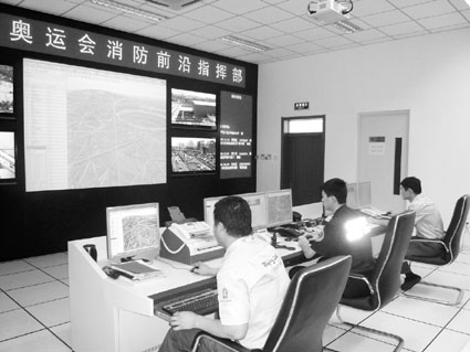 ▲消防官兵正在奧運消防前沿指揮部緊張工作