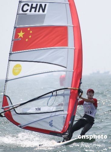 8月20日,北京2008奧運帆板比賽在青島分賽場舉行,在女子帆板RS-X級決賽里,中國選手殷劍獲得冠軍,為中國代表團奪得奧運會歷史上第一枚帆船項目的金牌。中新社發(fā) 趙振清 攝