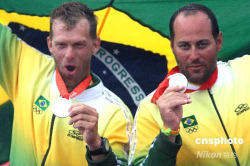 8月21日,2008奧運(yùn)帆船比賽在青島分賽場進(jìn)行最后一天比賽,在男子龍骨艇-星級(jí)-獎(jiǎng)牌輪比賽中,巴西組合羅伯特·沙伊特/布魯諾·普拉達(dá)獲得銀牌。 中新社發(fā) 趙振清 攝