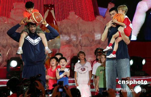 圖為姚明、詹姆斯與小球迷互動(dòng)。