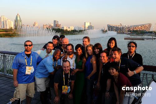 北京奧運接近尾聲,美國NBC電視臺等媒體記者合影留念惜別奧林匹克公園。中新社發(fā) 廖攀 攝