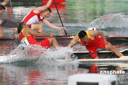 8月23日下午,在順義奧林匹克水上公園舉行的北京奧運會皮劃艇靜水男子雙人劃艇500米決賽中,經(jīng)過激烈爭奪,上屆奧運會冠軍、中國選手孟關(guān)良/楊文軍以1分41秒025的成績成功衛(wèi)冕,為中國皮劃艇隊奪得北京奧運會上的唯一一枚金牌,也是中國代表團本屆奧運會奪取的第48塊金牌。俄羅斯組合與德國組合分別以1分41秒282和1分41秒964分獲二、三名。中新社發(fā) 武仲林 攝