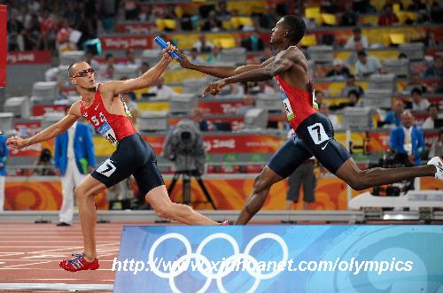 8月23日,美國(guó)隊(duì)選手杰里米·韋林納(左)從隊(duì)友戴維·內(nèi)維爾手中接棒。當(dāng)日,美國(guó)隊(duì)在北京奧運(yùn)會(huì)男子4X400米決賽中以2分55秒39的成績(jī)奪得金牌并打破奧運(yùn)會(huì)紀(jì)錄。新華社記者 李尕 攝