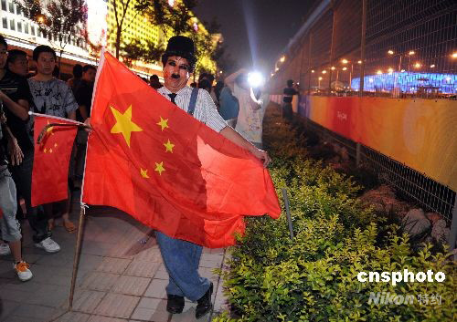 北京奧運會進入尾聲,奧林匹克公園外人流不減,一位市民扮演喜劇明星“卓別林”。中新社發(fā) 廖攀 攝