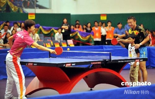 八月三十日,在北京奧運(yùn)奪得金牌的中國男女乒乓球運(yùn)動(dòng)員在香港示范表演,男單金牌得主馬琳指導(dǎo)一位小朋友與女單金牌得主張怡寧砌磋球技。中新社發(fā) 鄧慶樂 攝