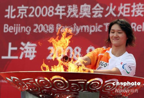 九月一日,北京殘奧會(huì)火炬接力“時(shí)代風(fēng)采線”第三站傳遞活動(dòng),在上海松江新城大學(xué)園區(qū)進(jìn)行,共有六十名火炬手參加。其中,殘疾人員有10名,其余為助殘、幫殘的先進(jìn)代表和基層殘疾人事業(yè)工作者。在北京奧運(yùn)會(huì)游泳比賽中獲得一銀兩銅佳績的上海運(yùn)動(dòng)員龐佳穎,參加火炬接力活動(dòng)。 中新社發(fā) 湯彥俊 攝
