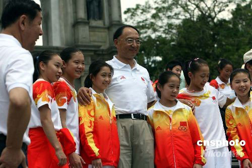 九月一日上午,北京奧運內(nèi)地金牌運動員代表團(tuán)在澳門展開第二日訪問行程,代表團(tuán)團(tuán)長劉鵬與奧運女子體操團(tuán)體金牌選手們在澳門著名景點大三巴前留影。中新社發(fā) 洪少葵 攝