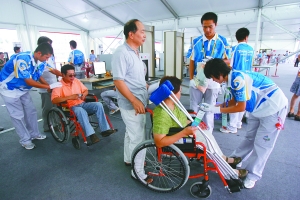 《京華時報》記者在距離“鳥巢”相對較遠的西側(cè)安檢大棚看到,每一個安檢大棚門和地面之間,都鋪設了灰色的地毯,并且地毯呈向下的坡形,讓坐著輪椅的觀眾出入非常輕松。