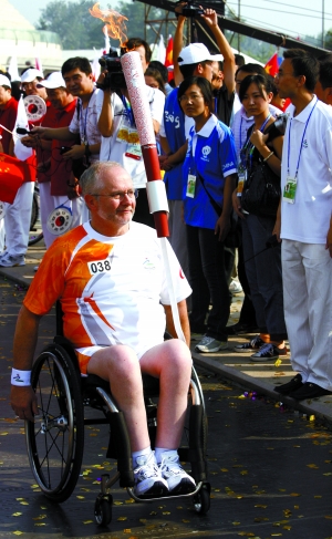 昨天上午,國際殘奧委會(huì)主席克雷文在世紀(jì)壇完成了第38棒傳遞。不需幫扶,他用自己強(qiáng)健的雙臂搖動(dòng)輪椅“跑”完全程,印證了他對(duì)“殘疾人需要獨(dú)立”的理念。傳遞時(shí)間雖短,但中午記者在其下榻飯店采訪時(shí),他仍余興未盡,他興致勃勃地談起了他對(duì)北京、對(duì)殘疾人運(yùn)動(dòng)的看法。
