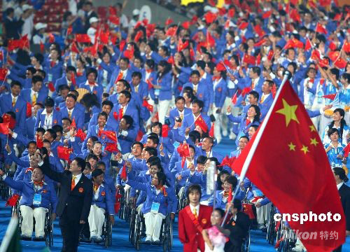 9月6日晚,北京2008殘奧會(huì)開(kāi)幕式在北京國(guó)家體育場(chǎng)——“鳥(niǎo)巢”舉行,圖為由547人組成的龐大東道主代表團(tuán)--中國(guó)殘奧代表團(tuán)入場(chǎng),旗手是刷新3項(xiàng)世界紀(jì)錄的20歲的中國(guó)殘疾人游泳運(yùn)動(dòng)員王曉福。 中新社發(fā) 宋吉河 攝