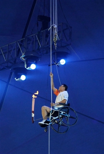 中新網(wǎng)9月6日電 北京殘奧會(huì)開(kāi)幕式今晚在北京國(guó)家體育場(chǎng)隆重開(kāi)幕,殘疾人跳高運(yùn)動(dòng)員侯斌點(diǎn)燃?xì)垔W會(huì)圣火主火炬臺(tái)。