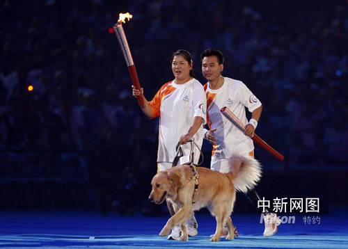 北京殘奧會(huì)開(kāi)幕式上平亞麗帶導(dǎo)盲犬傳遞火炬