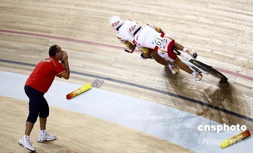 9月7日,北京殘奧會(huì)場(chǎng)地自行車項(xiàng)目的角逐在北京老山自行車館正式拉開帷幕。在男子個(gè)人追逐賽(B&VI)資格賽中,西班牙隊(duì)教練在場(chǎng)邊指導(dǎo)西班牙選手克里斯蒂安·本赫和領(lǐng)騎員戴維·廖拉多。中新社發(fā) 盛佳鵬 攝