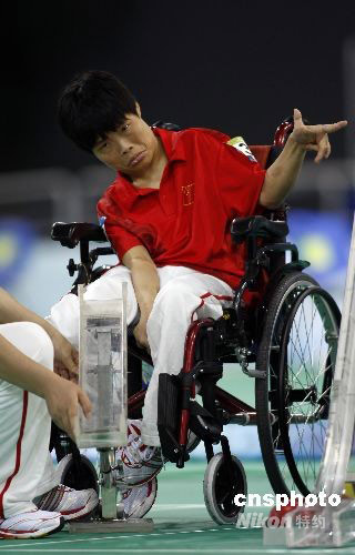 9月7日,北京殘奧會(huì)硬地滾球比賽,中國選手朱賀僑在混合單打BC3級(jí)別小組賽中以1比11不敵希臘選手格里戈里奧斯。中新社發(fā) 杜洋 攝