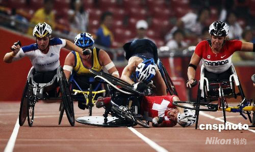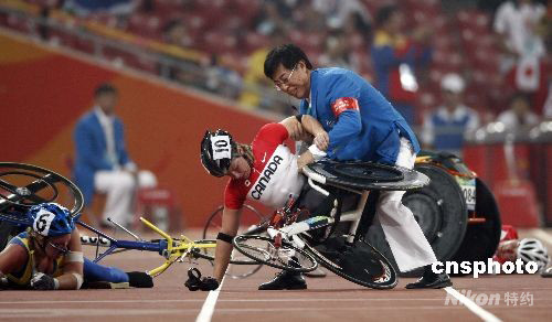 殘奧會(huì)女子5000米(T54級(jí))決賽中選手相撞倒地