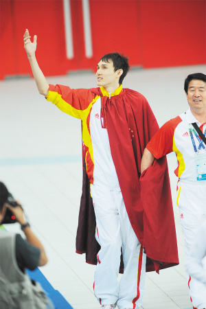 雖然最終收獲的還是“銀鑲玉”,但是楊博尊的心情已和8日晚有著天壤之別,臉上掛滿了笑容。“這雖然不是我的主項(xiàng),但是我發(fā)揮得很好,超越了自己,F(xiàn)在我終于知道,‘水立方’不僅有‘金鑲玉’,還有更多的是超越。無(wú)論是我,還是我的隊(duì)友,我們都很努力,都在不斷地超越自己!迸d奮的楊博尊披上了早就準(zhǔn)備好的“戰(zhàn)袍”,這本是他為自己奪冠時(shí)準(zhǔn)備的。