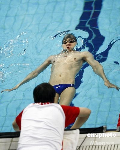9月15日晚,北京殘奧會(huì)男子50米仰泳S3級(jí)決賽在北京國家游泳中心“水立方”進(jìn)行,中國選手李漢華在教練的幫助下準(zhǔn)備出發(fā)。中新社發(fā) 盛佳鵬 攝