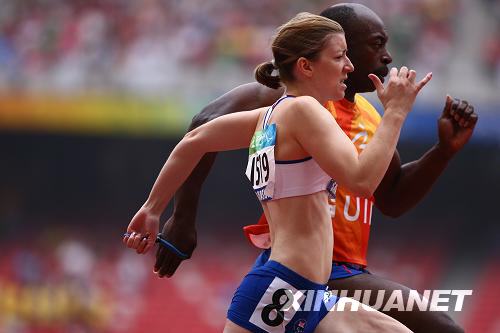 英國選手莉比·克萊格(前)在領(lǐng)跑員的引導(dǎo)下進(jìn)行女子100米T12級(jí)預(yù)賽。新華社記者 張燕輝 攝