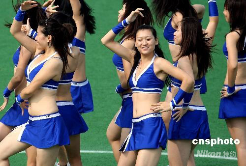 9月17日下午,北京殘奧會五人制足球決賽在北京奧林匹克公園內的橄欖球場舉行,中國隊與雅典殘奧會冠軍巴西隊冒著高溫奉獻一場精彩的比賽。比賽間隙,衣著性感的啦啦隊為觀眾奉獻熱舞。 中新社發(fā) 任晨鳴 攝