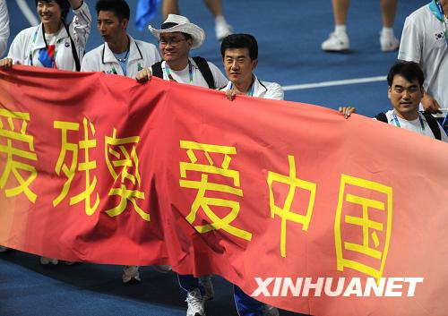 韓國代表團(tuán)舉著“愛殘奧 愛中國”的橫幅入場。新華社記者 索朗羅布 攝