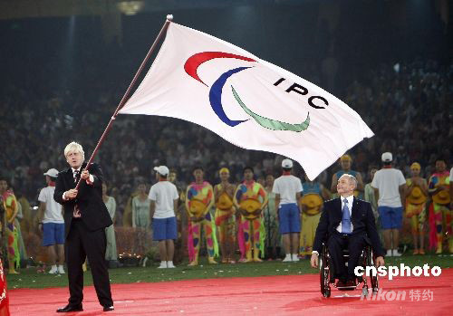9月17日晚,北京2008年殘奧會閉幕式在國家體育場舉行。倫敦市長約翰遜在交接旗儀式上,揮舞國際殘奧委會會旗。 中新社發(fā) 杜洋 攝