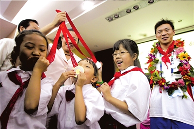 昨天,在殘奧會上收獲2金2銀1銅的中國運動員何軍權(quán)來到北京精誠實驗小學(xué),向小學(xué)生們展示他獲得的“金鑲玉”。作為該校的校外輔導(dǎo)員,何軍權(quán)與他們一起分享了自己在殘奧會上收獲的榮譽和感動,講述了自己的奮斗經(jīng)歷。失去雙臂的他成為孩子們心目中的英雄。何軍權(quán)說,北京殘奧會是他最后一次參加國際比賽,之后他將回到湖北荊門市殘聯(lián)工作。