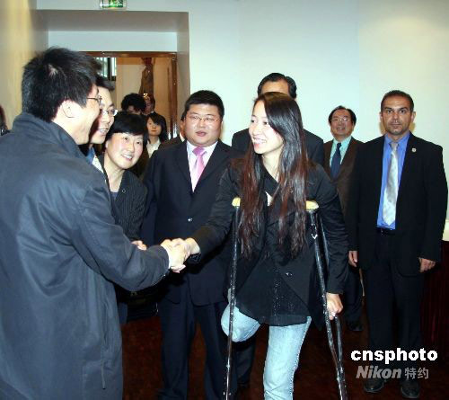 十九日晚,曾與中國奧運火炬手金晶結(jié)下“戰(zhàn)斗友誼”的旅法華僑華人和中國留學(xué)生在巴黎舉行歡迎會,以掌聲和親情迎接金晶重返巴黎,訪問法國。圖為金晶與部分一同參與北京奧運火炬巴黎傳遞的華人與留學(xué)生火炬手、護(hù)衛(wèi)手等“老戰(zhàn)友”喜重逢。中新社發(fā) 吳衛(wèi)中 攝