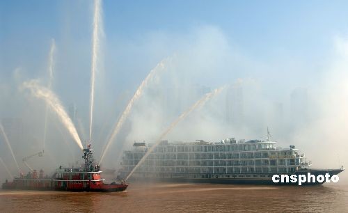 圖:重慶舉行內(nèi)河旅游客輪火災(zāi)撲救演習