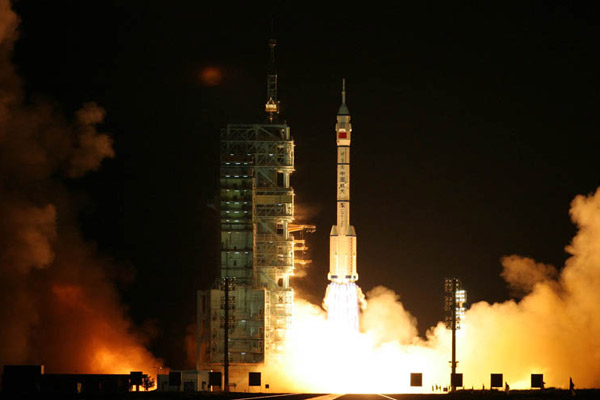 | 北京時(shí)間25日21時(shí)10分,中國(guó)自行研制的第三艘載人飛船神舟七號(hào),在酒泉衛(wèi)星發(fā)射中心載人航天發(fā)射場(chǎng)由“長(zhǎng)征二號(hào)F”運(yùn)載火箭發(fā)射升空。3名航天員翟志剛、劉伯明、景海鵬組成乘組執(zhí)行飛行任務(wù)。27日下午16時(shí)43分左右,身著中國(guó)自行研制的第一套艙外航天服——“飛天”艙外航天服的航天員翟志剛順利出艙,成功實(shí)施中國(guó)首次空間出艙活動(dòng)。28日17時(shí)37分,中國(guó)“神舟”七號(hào)飛船在內(nèi)蒙古中部預(yù)定區(qū)域成功著陸。隨后,執(zhí)行飛行任務(wù)的三位航天員安全出艙,中國(guó)神舟七號(hào)載人航天飛行獲得圓滿(mǎn)成功。